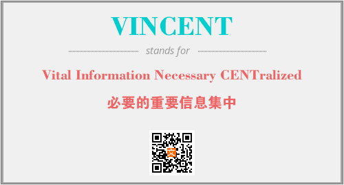 上述内容是“Vital Information Necessary CENTralized”作为“VINCENT”的缩写,解释为“必要的重要信息集中”时的信息,以及英文缩略词VINCENT所代表的英文单词,其对应的中文拼音、详细解释以及在英文中的流行度和相关分类、应用领域及应用示例等。