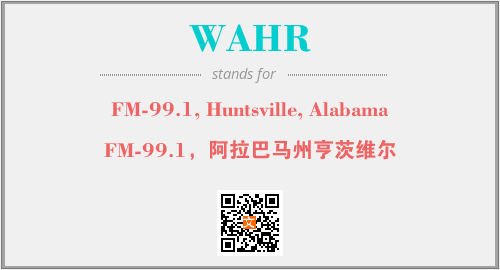 上述内容是“FM-99.1, Huntsville, Alabama”作为“WAHR”的缩写,解释为“FM-99.1,阿拉巴马州亨茨维尔”时的信息,以及英文缩略词WAHR所代表的英文单词,其对应的中文拼音、详细解释以及在英文中的流行度和相关分类、应用领域及应用示例等。