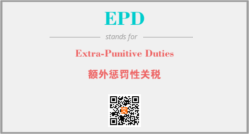 上述内容是“Extra-Punitive Duties”作为“EPD”的缩写,解释为“额外惩罚性关税”时的信息,以及英文缩略词EPD所代表的英文单词,其对应的中文拼音、详细解释以及在英文中的流行度和相关分类、应用领域及应用示例等。