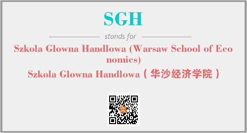 上述内容是“Szkola Glowna Handlowa (Warsaw School of Economics)”作为“SGH”的缩写,解释为“Szkola Glowna Handlowa(华沙经济学院)”时的信息,以及英文缩略词SGH所代表的英文单词,其对应的中文拼音、详细解释以及在英文中的流行度和相关分类、应用领域及应用示例等。