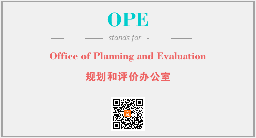 英文缩略词“OPE”经常作为“Office of Planning and Evaluation”的英文缩写来使用,中文表示:“规划和评价办公室”。本文将详细介绍英文缩写词OPE所代表英文单词,其对应的中文拼音、详细解释以及在英语中的流行度。此外,还有关于缩略词OPE的分类、应用领域及相关应用示例等。