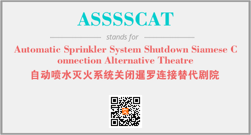 上述内容是“Automatic Sprinkler System Shutdown Siamese Connection Alternative Theatre”作为“ASSSSCAT”的缩写,解释为“自动喷水灭火系统关闭暹罗连接替代剧院”时的信息,以及英文缩略词ASSSSCAT所代表的英文单词,其对应的中文拼音、详细解释以及在英文中的流行度和相关分类、应用领域及应用示例等。