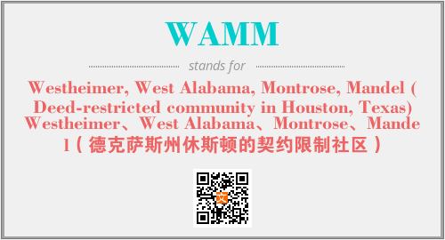 以上为Westheimer, West Alabama, Montrose, Mandel (Deed-restricted community in Houston, Texas)英文缩略词WAMM的中文解释,以及该英文缩写在英语的流行度、分类和应用领域方面的信息。