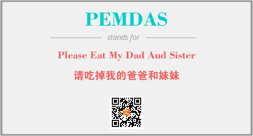 英文缩略词“PEMDAS”经常作为“Please Eat My Dad And Sister”的英文缩写来使用,中文表示:“请吃掉我的爸爸和妹妹”。本文将详细介绍英文缩写词PEMDAS所代表英文单词,其对应的中文拼音、详细解释以及在英语中的流行度。此外,还有关于缩略词PEMDAS的分类、应用领域及相关应用示例等。