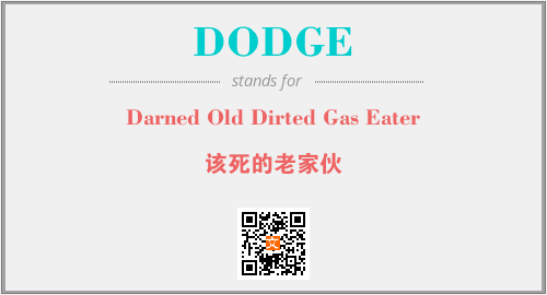 上述内容是“Darned Old Dirted Gas Eater”作为“DODGE”的缩写,解释为“该死的老家伙”时的信息,以及英文缩略词DODGE所代表的英文单词,其对应的中文拼音、详细解释以及在英文中的流行度和相关分类、应用领域及应用示例等。