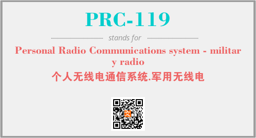 上述内容是“Personal Radio Communications system - military radio”作为“PRC-119”的缩写,解释为“个人无线电通信系统.军用无线电”时的信息,以及英文缩略词PRC-119所代表的英文单词,其对应的中文拼音、详细解释以及在英文中的流行度和相关分类、应用领域及应用示例等。