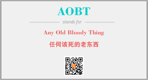 英文缩略词“AOBT”经常作为“Any Old Bloody Thing”的英文缩写来使用,中文表示:“任何该死的老东西”。本文将详细介绍英文缩写词AOBT所代表英文单词,其对应的中文拼音、详细解释以及在英语中的流行度。此外,还有关于缩略词AOBT的分类、应用领域及相关应用示例等。