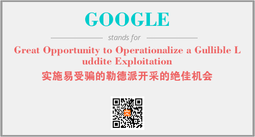 上述内容是“Great Opportunity to Operationalize a Gullible Luddite Exploitation”作为“GOOGLE”的缩写,解释为“实施易受骗的勒德派开采的绝佳机会”时的信息,以及英文缩略词GOOGLE所代表的英文单词,其对应的中文拼音、详细解释以及在英文中的流行度和相关分类、应用领域及应用示例等。