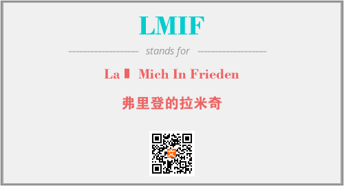 上述内容是“Laß Mich In Frieden”作为“LMIF”的缩写,解释为“弗里登的拉米奇”时的信息,以及英文缩略词LMIF所代表的英文单词,其对应的中文拼音、详细解释以及在英文中的流行度和相关分类、应用领域及应用示例等。