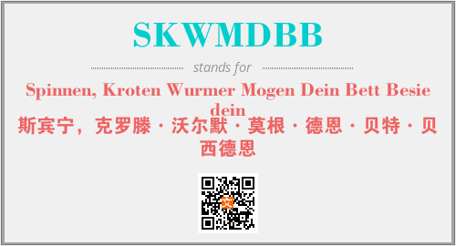 英文缩略词“SKWMDBB”经常作为“Spinnen, Kroten Wurmer Mogen Dein Bett Besiedein”的英文缩写来使用,中文表示:“斯宾宁,克罗滕·沃尔默·莫根·德恩·贝特·贝西德恩”。本文将详细介绍英文缩写词SKWMDBB所代表英文单词,其对应的中文拼音、详细解释以及在英语中的流行度。此外,还有关于缩略词SKWMDBB的分类、应用领域及相关应用示例等。