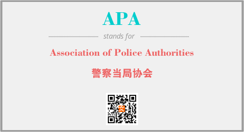 上述内容是“Association of Police Authorities”作为“APA”的缩写,解释为“警察当局协会”时的信息,以及英文缩略词APA所代表的英文单词,其对应的中文拼音、详细解释以及在英文中的流行度和相关分类、应用领域及应用示例等。