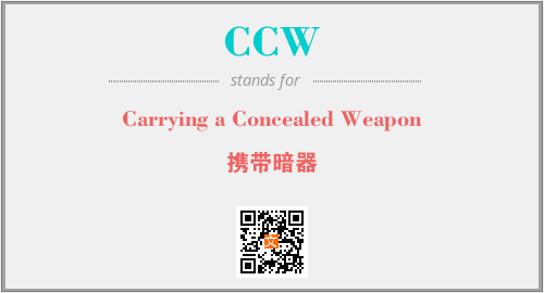 英文缩略词“CCW”经常作为“Carrying a Concealed Weapon”的英文缩写来使用,中文表示:“携带暗器”。本文将详细介绍英文缩写词CCW所代表英文单词,其对应的中文拼音、详细解释以及在英语中的流行度。此外,还有关于缩略词CCW的分类、应用领域及相关应用示例等。