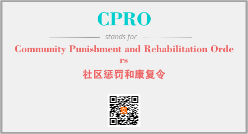 英文缩略词“CPRO”经常作为“Community Punishment and Rehabilitation Orders”的英文缩写来使用,中文表示:“社区惩罚和康复令”。本文将详细介绍英文缩写词CPRO所代表英文单词,其对应的中文拼音、详细解释以及在英语中的流行度。此外,还有关于缩略词CPRO的分类、应用领域及相关应用示例等。