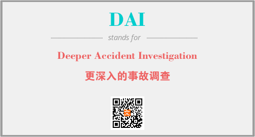 上述内容是“Deeper Accident Investigation”作为“DAI”的缩写,解释为“更深入的事故调查”时的信息,以及英文缩略词DAI所代表的英文单词,其对应的中文拼音、详细解释以及在英文中的流行度和相关分类、应用领域及应用示例等。