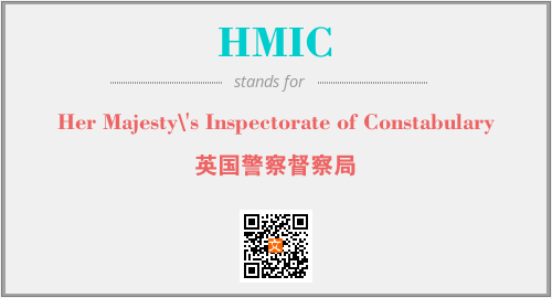 上述内容是“Her Majesty\'s Inspectorate of Constabulary”作为“HMIC”的缩写,解释为“英国警察督察局”时的信息,以及英文缩略词HMIC所代表的英文单词,其对应的中文拼音、详细解释以及在英文中的流行度和相关分类、应用领域及应用示例等。