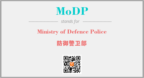 上述内容是“Ministry of Defence Police”作为“MoDP”的缩写,解释为“防御警卫部”时的信息,以及英文缩略词MoDP所代表的英文单词,其对应的中文拼音、详细解释以及在英文中的流行度和相关分类、应用领域及应用示例等。