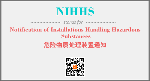 上述内容是“Notification of Installations Handling Hazardous Substances”作为“NIHHS”的缩写,解释为“危险物质处理装置通知”时的信息,以及英文缩略词NIHHS所代表的英文单词,其对应的中文拼音、详细解释以及在英文中的流行度和相关分类、应用领域及应用示例等。
