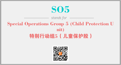 上述内容是“Special Operations Group 5 (Child Protection Unit)”作为“SO5”的缩写,解释为“特别行动组5(儿童保护股)”时的信息,以及英文缩略词SO5所代表的英文单词,其对应的中文拼音、详细解释以及在英文中的流行度和相关分类、应用领域及应用示例等。