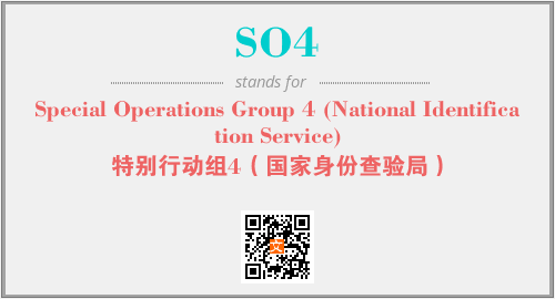 上述内容是“Special Operations Group 4 (National Identification Service)”作为“SO4”的缩写,解释为“特别行动组4(国家身份查验局)”时的信息,以及英文缩略词SO4所代表的英文单词,其对应的中文拼音、详细解释以及在英文中的流行度和相关分类、应用领域及应用示例等。