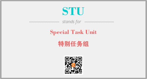 上述内容是“Special Task Unit”作为“STU”的缩写,解释为“特别任务组”时的信息,以及英文缩略词STU所代表的英文单词,其对应的中文拼音、详细解释以及在英文中的流行度和相关分类、应用领域及应用示例等。