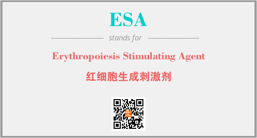 英文缩略词“ESA”经常作为“Erythropoiesis Stimulating Agent”的英文缩写来使用,中文表示:“红细胞生成刺激剂”。本文将详细介绍英文缩写词ESA所代表英文单词,其对应的中文拼音、详细解释以及在英语中的流行度。此外,还有关于缩略词ESA的分类、应用领域及相关应用示例等。