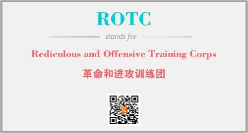 英文缩略词“ROTC”经常作为“Rediculous and Offensive Training Corps”的英文缩写来使用,中文表示:“革命和进攻训练团”。本文将详细介绍英文缩写词ROTC所代表英文单词,其对应的中文拼音、详细解释以及在英语中的流行度。此外,还有关于缩略词ROTC的分类、应用领域及相关应用示例等。