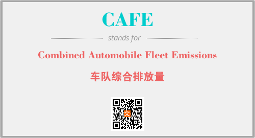 上述内容是“Combined Automobile Fleet Emissions”作为“CAFE”的缩写,解释为“车队综合排放量”时的信息,以及英文缩略词CAFE所代表的英文单词,其对应的中文拼音、详细解释以及在英文中的流行度和相关分类、应用领域及应用示例等。