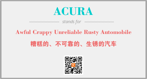 以上为Awful Crappy Unreliable Rusty Automobile英文缩略词ACURA的中文解释,以及该英文缩写在英语的流行度、分类和应用领域方面的信息。