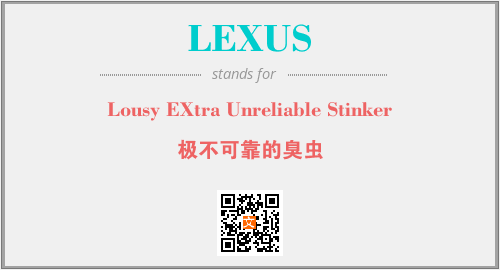 上述内容是“Lousy EXtra Unreliable Stinker”作为“LEXUS”的缩写,解释为“极不可靠的臭虫”时的信息,以及英文缩略词LEXUS所代表的英文单词,其对应的中文拼音、详细解释以及在英文中的流行度和相关分类、应用领域及应用示例等。