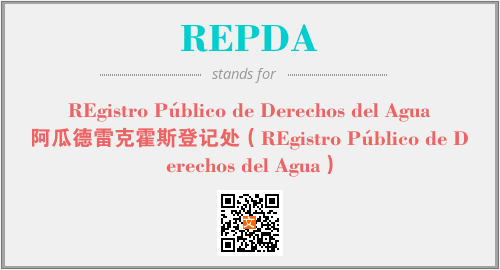 上述内容是“REgistro Público de Derechos del Agua”作为“REPDA”的缩写,解释为“阿瓜德雷克霍斯登记处(REgistro Público de Derechos del Agua)”时的信息,以及英文缩略词REPDA所代表的英文单词,其对应的中文拼音、详细解释以及在英文中的流行度和相关分类、应用领域及应用示例等。