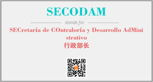 上述内容是“SECretaría de COntraloría y Desarrollo AdMinistrativo”作为“SECODAM”的缩写,解释为“行政部长”时的信息,以及英文缩略词SECODAM所代表的英文单词,其对应的中文拼音、详细解释以及在英文中的流行度和相关分类、应用领域及应用示例等。
