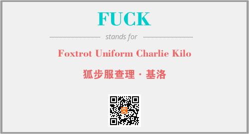 上述内容是“Foxtrot Uniform Charlie Kilo”作为“FUCK”的缩写,解释为“狐步服查理·基洛”时的信息,以及英文缩略词FUCK所代表的英文单词,其对应的中文拼音、详细解释以及在英文中的流行度和相关分类、应用领域及应用示例等。