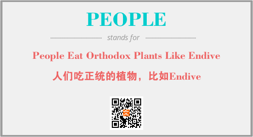 英文缩略词“PEOPLE”经常作为“People Eat Orthodox Plants Like Endive”的英文缩写来使用,中文表示:“人们吃正统的植物,比如Endive”。本文将详细介绍英文缩写词PEOPLE所代表英文单词,其对应的中文拼音、详细解释以及在英语中的流行度。此外,还有关于缩略词PEOPLE的分类、应用领域及相关应用示例等。