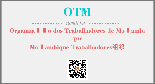 英文缩略词“OTM”经常作为“Organização dos Trabalhadores de Moçambique”的英文缩写来使用,中文表示:“Moçambique Trabalhadores组织”。本文将详细介绍英文缩写词OTM所代表英文单词,其对应的中文拼音、详细解释以及在英语中的流行度。此外,还有关于缩略词OTM的分类、应用领域及相关应用示例等。