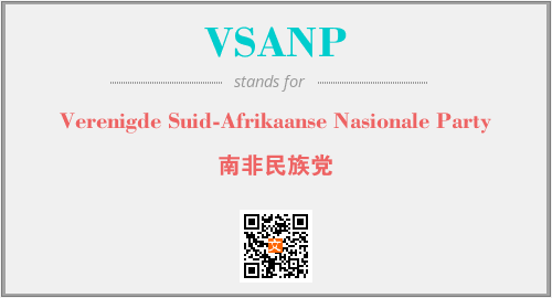 英文缩略词“VSANP”经常作为“Verenigde Suid-Afrikaanse Nasionale Party”的英文缩写来使用,中文表示:“南非民族党”。本文将详细介绍英文缩写词VSANP所代表英文单词,其对应的中文拼音、详细解释以及在英语中的流行度。此外,还有关于缩略词VSANP的分类、应用领域及相关应用示例等。