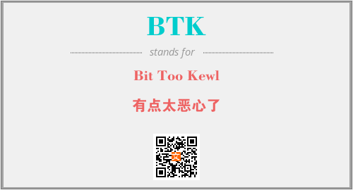 上述内容是“Bit Too Kewl”作为“BTK”的缩写,解释为“有点太恶心了”时的信息,以及英文缩略词BTK所代表的英文单词,其对应的中文拼音、详细解释以及在英文中的流行度和相关分类、应用领域及应用示例等。