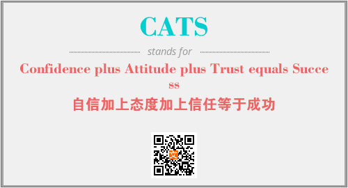 上述内容是“Confidence plus Attitude plus Trust equals Success”作为“CATS”的缩写,解释为“自信加上态度加上信任等于成功”时的信息,以及英文缩略词CATS所代表的英文单词,其对应的中文拼音、详细解释以及在英文中的流行度和相关分类、应用领域及应用示例等。