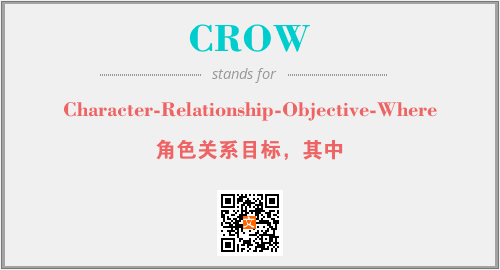 上述内容是“Character-Relationship-Objective-Where”作为“CROW”的缩写,解释为“角色关系目标,其中”时的信息,以及英文缩略词CROW所代表的英文单词,其对应的中文拼音、详细解释以及在英文中的流行度和相关分类、应用领域及应用示例等。