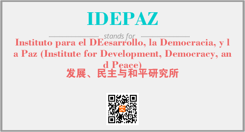 上述内容是“Instituto para el DEesarrollo, la Democracia, y la Paz (Institute for Development, Democracy, and Peace)”作为“IDEPAZ”的缩写,解释为“发展、民主与和平研究所”时的信息,以及英文缩略词IDEPAZ所代表的英文单词,其对应的中文拼音、详细解释以及在英文中的流行度和相关分类、应用领域及应用示例等。