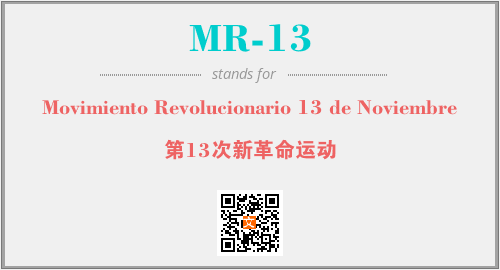 英文缩略词“MR-13”经常作为“Movimiento Revolucionario 13 de Noviembre”的英文缩写来使用,中文表示:“第13次新革命运动”。本文将详细介绍英文缩写词MR-13所代表英文单词,其对应的中文拼音、详细解释以及在英语中的流行度。此外,还有关于缩略词MR-13的分类、应用领域及相关应用示例等。