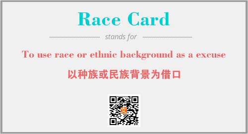 上述内容是“To use race or ethnic background as a excuse”作为“Race Card”的缩写,解释为“以种族或民族背景为借口”时的信息,以及英文缩略词Race Card所代表的英文单词,其对应的中文拼音、详细解释以及在英文中的流行度和相关分类、应用领域及应用示例等。