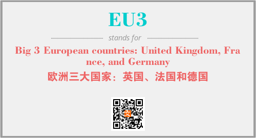 上述内容是“Big 3 European countries: United Kingdom, France, and Germany”作为“EU3”的缩写,解释为“欧洲三大国家:英国、法国和德国”时的信息,以及英文缩略词EU3所代表的英文单词,其对应的中文拼音、详细解释以及在英文中的流行度和相关分类、应用领域及应用示例等。