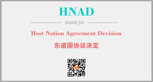 上述内容是“Host Nation Agreement Decision”作为“HNAD”的缩写,解释为“东道国协议决定”时的信息,以及英文缩略词HNAD所代表的英文单词,其对应的中文拼音、详细解释以及在英文中的流行度和相关分类、应用领域及应用示例等。