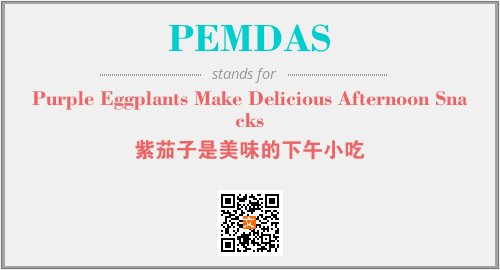 英文缩略词“PEMDAS”经常作为“Purple Eggplants Make Delicious Afternoon Snacks”的英文缩写来使用,中文表示:“紫茄子是美味的下午小吃”。本文将详细介绍英文缩写词PEMDAS所代表英文单词,其对应的中文拼音、详细解释以及在英语中的流行度。此外,还有关于缩略词PEMDAS的分类、应用领域及相关应用示例等。