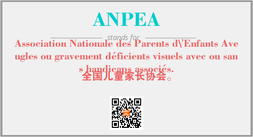 英文缩略词“ANPEA”经常作为“Association Nationale des Parents d\'Enfants Aveugles ou gravement déficients visuels avec ou sans handicaps associés.”的英文缩写来使用,中文表示:“全国儿童家长协会。”。本文将详细介绍英文缩写词ANPEA所代表英文单词,其对应的中文拼音、详细解释以及在英语中的流行度。此外,还有关于缩略词ANPEA的分类、应用领域及相关应用示例等。