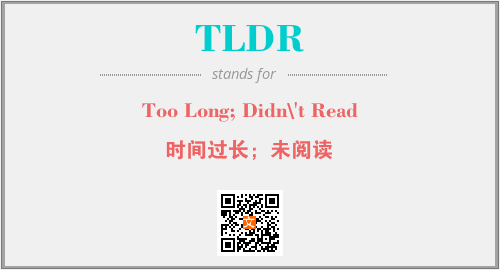 以上为Too Long; Didn\'t Read英文缩略词TLDR的中文解释,以及该英文缩写在英语的流行度、分类和应用领域方面的信息。