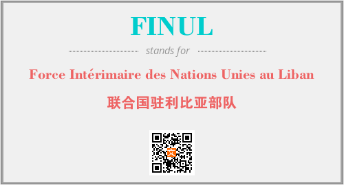 上述内容是“Force Intérimaire des Nations Unies au Liban”作为“FINUL”的缩写,解释为“联合国驻利比亚部队”时的信息,以及英文缩略词FINUL所代表的英文单词,其对应的中文拼音、详细解释以及在英文中的流行度和相关分类、应用领域及应用示例等。
