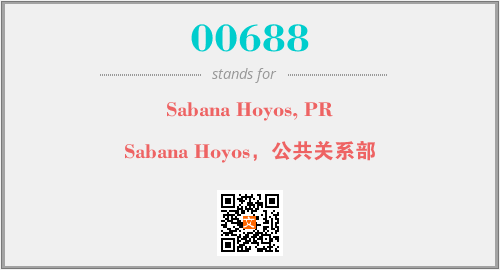 上述内容是“Sabana Hoyos, PR”作为“00688”的缩写,解释为“Sabana Hoyos,公共关系部”时的信息,以及英文缩略词00688所代表的英文单词,其对应的中文拼音、详细解释以及在英文中的流行度和相关分类、应用领域及应用示例等。