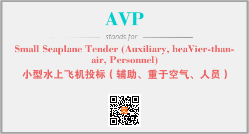 英文缩略词“AVP”经常作为“Small Seaplane Tender (Auxiliary, heaVier-than-air, Personnel)”的英文缩写来使用,中文表示:“小型水上飞机投标(辅助、重于空气、人员)”。本文将详细介绍英文缩写词AVP所代表英文单词,其对应的中文拼音、详细解释以及在英语中的流行度。此外,还有关于缩略词AVP的分类、应用领域及相关应用示例等。