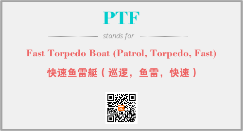 上述内容是“Fast Torpedo Boat (Patrol, Torpedo, Fast)”作为“PTF”的缩写,解释为“快速鱼雷艇(巡逻,鱼雷,快速)”时的信息,以及英文缩略词PTF所代表的英文单词,其对应的中文拼音、详细解释以及在英文中的流行度和相关分类、应用领域及应用示例等。